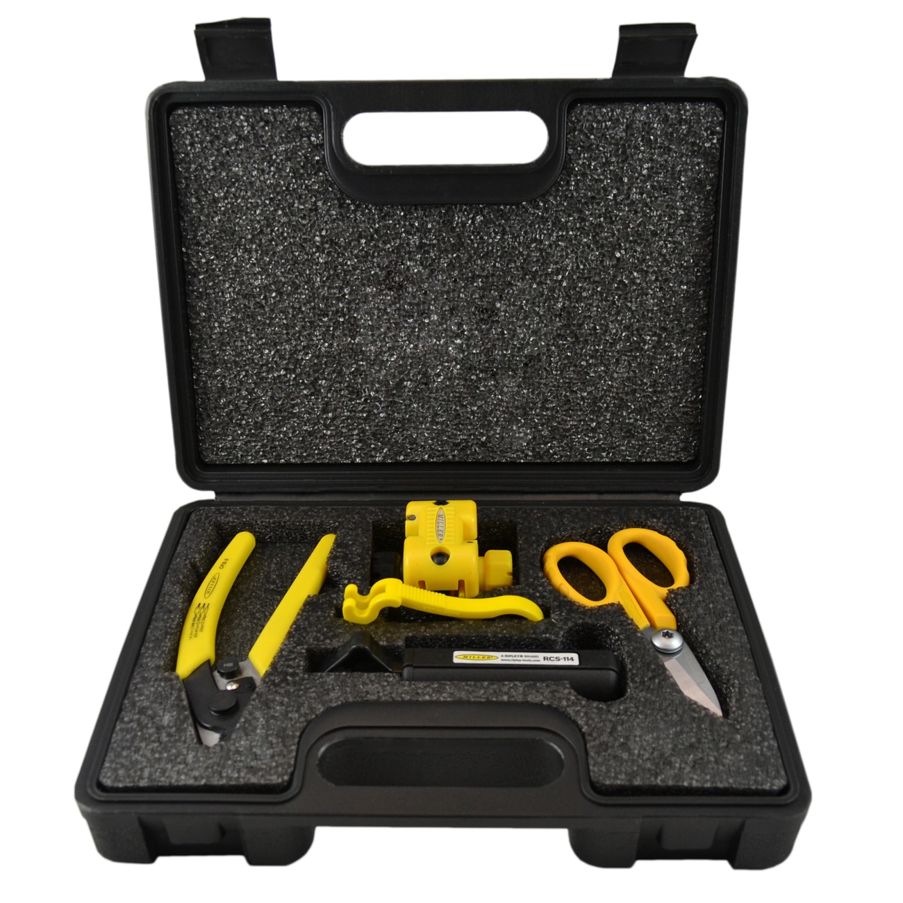 Im Kit enthaltene Artikel: Hartplastikkoffer mit Schaumstoffauskleidung, CFS-3-Serie, Glasfaser-Abisolierer, KS-1-Serie, Glasfaser-Kevlar®-Schere, RCS-114-Serie, Kabelabisolierer für harte Kabelummantelungen, FTS-Serie, Buffer Tube Scorer, MSAT® 16 Series Mid-Span Fiber Access Tool